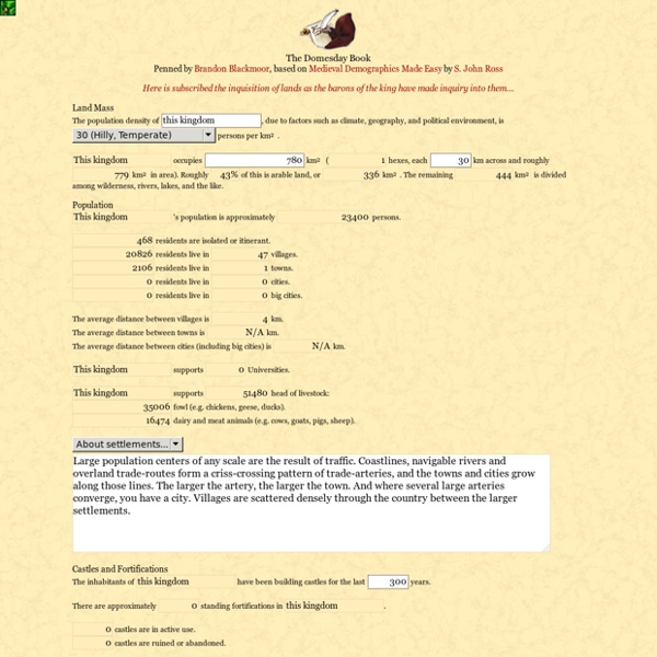 The Domesday Book Penned by Brandon Blackmoor, based on Medieval Demographics Made Easy by S. John Ross Here is subscribed the inquisition of lands as the barons of the king have made inquiry into them... <p>Forsooth, thy browser is truly antiquated! Thou canst not access this web site with a browser such as thine. Land Mass The population density of , due to factors such as climate, geography, and political environment, is persons per km2 . occupies km2 ( hexes, each km across and roughly km2 in area). Population 's population is approximately persons. residents are isolated or itinerant. residents live in villages. residents live in towns. residents live in cities. residents live in big cities. The average distance between villages is km. supports Universities. supports head of livestock: fowl (e.g. chickens, geese, ducks). dairy and meat animals (e.g. cows, goats, pigs, sheep). Large population centers of any scale are the result of traffic. Castles and Fortifications Towns and Cities